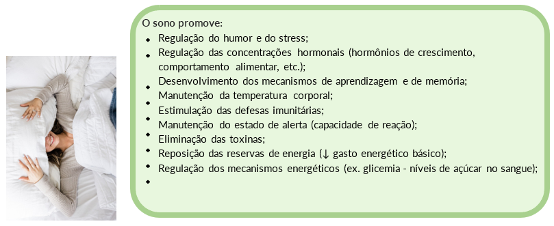 O sono é a forma mais completa de descanso. Permite que o corpo se recupere física e mentalmente. Influencia uma série de mecanismos do organismo, como a imunidade e o equilíbrio energético (equilíbrio entre o consumo e o gasto de calorias).