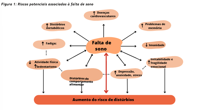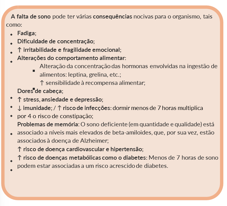 - Um período de sono mais curto foi associado a um aumento da ingestão calórica diária e da densidade energética* dos alimentos consumidos. Estudos demonstram que a falta de sono pode levar a um aumento da atividade cerebral perante alimentos de elevado valor energético (batatas fritas, bolos, etc.) e a perturbações hormonais, o que pode justificar uma alteração do comportamento alimentar, incluindo um aumento do consumo de calorias. Esse aumento pode levar a um ganho de peso e, por conseguinte, a um risco de obesidade e hiperfagia (figura 1).