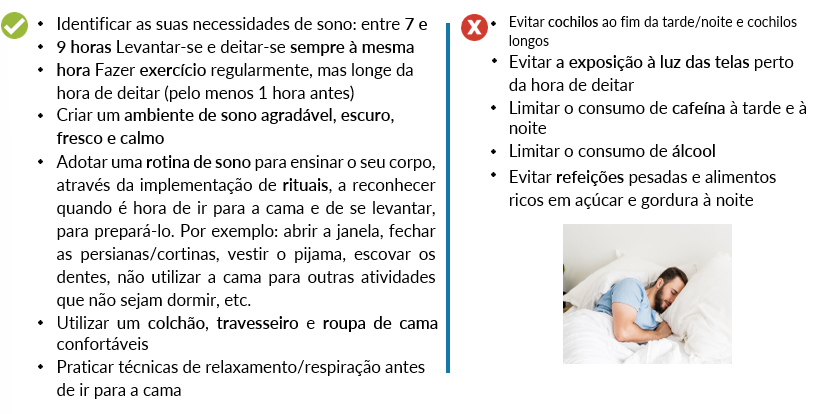 O sono é essencial para o bom funcionamento do organismo, e, por isso, é fundamental preservá-lo. A melhor maneira de melhorar o sono é estabelecer uma boa higiene e uma rotina de sono. Se você tiver dificuldade para dormir, recomendamos que marque uma consulta com o seu médico de família, que poderá, se necessário, encaminhá-lo para um especialista qualificado.