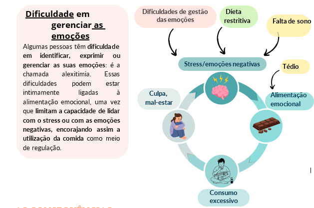 A alimentação emocional, ou “patológica”, é frequentemente acompanhada de emoções negativas como a culpa, a vergonha, o stress, o sentimento de impotência ou a baixa autoestima. Ela pode também provocar sintomas físicos, tais como problemas digestivos ou náuseas.