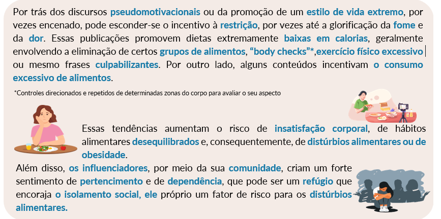 São certas tendências, como os conteúdos «pro-ana» (que promovem a magreza extrema como estilo de vida), «fitspiration» (que glorificam uma procura extrema de magreza e de desempenho físico) ou o hashtag #SkinnyTok, que difunde mensagens particularmente nocivas.