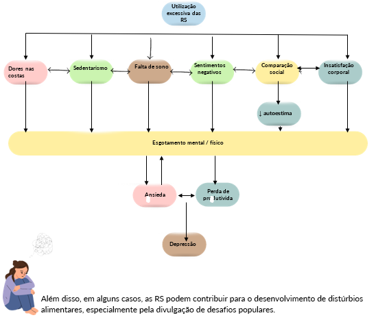 A utilização excessiva das redes sociais pode ter várias consequências psicológicas, emocionais e físicas. Pode gerar sentimentos negativos e incentivar comparações sociais ascendentes*. Essa comparação pode reforçar um sentimento de inferioridade e, consequentemente, diminuir a autoestima. Contribui igualmente para a interiorização da magreza e da insatisfação corporal (consulte a Newsletter «A imagem corporal e a sua importância»). A longo prazo, essas consequências podem facilmente levar ao esgotamento mental e à ansiedade.