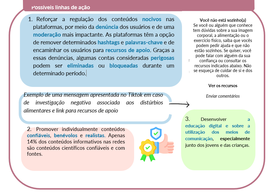As plataformas têm dificuldades em barrar a propagação destas tendências prejudiciais. O TikTok retirou oficialmente o hashtag #SkinnyTok. Infelizmente, surgem constantemente alternativas que escapam à moderação. É então necessário adotar soluções sustentáveis para contrariar esses movimentos, que tiram partido simultaneamente das falhas da moderação e do poder dos algoritmos.