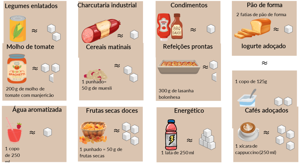 As principais fontes de açúcares adicionados aos alimentos são as bebidas adoçadas (refrigerantes, sucos de fruta, café adoçado, chocolate quente, etc.), as sobremesas e os snacks doces, como os bolos, as bolachas e os sorvetes, bem como os cereais matinais e os iogurtes. Todos os produtos processados doces contêm açúcar adicionado, mas é também o caso da maioria dos produtos processados salgados (molhos, condimentos, conservas, etc.) e de todas as refeições prontas (lasanha, peixe, etc.).
