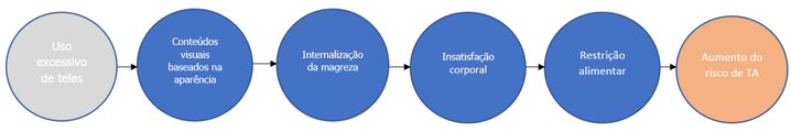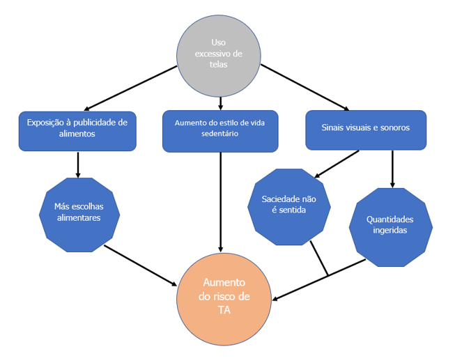 - Por meio da veiculação de anúncios que promovem produtos alimentícios calóricos e pouco nutritivos, as telas podem orientar os consumidores para escolhas alimentares hedônicas e, assim, incentivar o desenvolvimento de transtornos alimentares compulsivos e obesidade. Além disso, o uso excessivo de telas geralmente está associado a um estilo de vida sedentário (consulte a ficha de Atividade física) e a lanches (consulte a ficha de Alimentação), o que pode contribuir para o ganho de peso e maus hábitos alimentares.