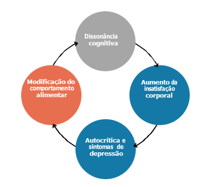 A dissonância cognitiva é um estado emocional negativo que podemos experimentar quando nossas ações estão em desacordo com nossas crenças, valores e objetivos. Esse estado emocional geralmente leva ao aumento da insatisfação corporal, mas também da ansiedade e emoções negativas, que já foram associadas a um risco maior de TA e obesidade na literatura científica (consulte a ficha sobre emoções).