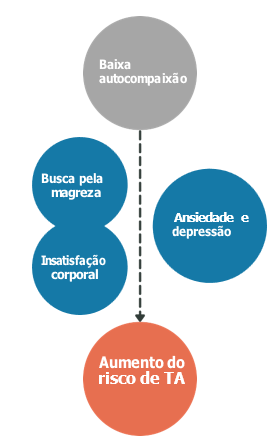 A baixa autocompaixão tem sido associada ao aumento da insatisfação como corpo, a uma maior busca pela magreza e a sintomas associados ao TA e à obesidade. De fato, a baixa autocompaixão contribui para uma alteração no processamento de emoções negativas, levando a um aumento da depressão e da ansiedade , que são os principais fatores de risco para essas patologias (consulte ansiedade e depressão).