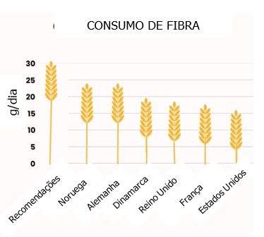 O consumo médio de fibra na maioria dos países situa-se atualmente entre 15 e 25 gramas/dia..