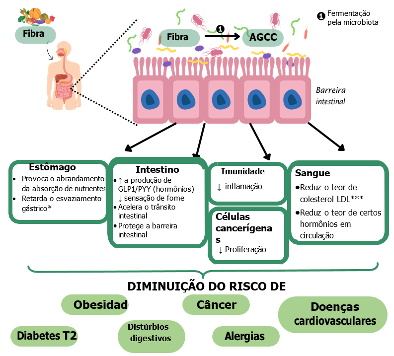 As provas acumulam-se quanto aos efeitos benéficos do consumo de fibra alimentar para a saúde humana. Os estudos mais recentes demonstram que a fermentação da fibra ingerida, pela microbiota, resulta na produção de ácidos graxos de cadeia curta (AGCC). Os AGCC favorecem o crescimento de microrganismos benéficos, impedindo, assim, a colonização de bactérias patogênicas. Além disso, os AGCC oferecem numerosos benefícios para a saúde, como ilustrado no gráfico abaixo: