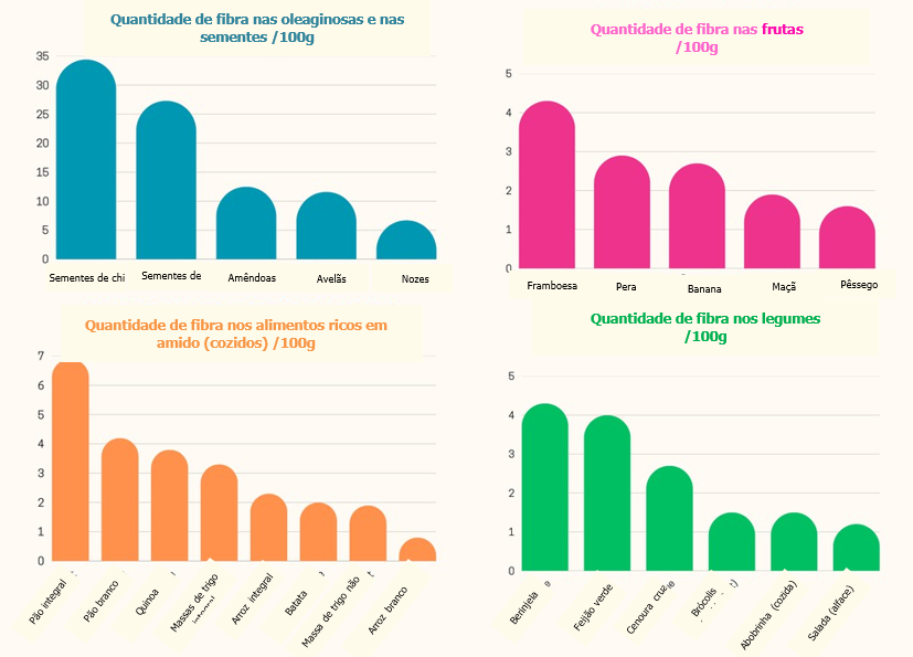 Como ilustram os gráficos, o teor de fibra varia de um alimento para outro. Porém, é essencial considerar a quantidade de fibra em relação a uma porção típica para interpretar corretamente esses dados.