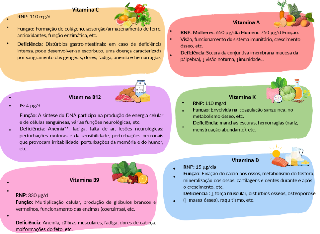 As necessidades diárias de vitaminas podem variar consoante a idade, o sexo e a situação da pessoa (grávida, lactante, doença renal, etc.). Seguem-se alguns exemplos de vitaminas, a sua Referência Nutricional da População (RNP) ou Ingestão Satisfatória (IS), com base em dados disponíveis na literatura, e alguns sintomas sentidos em caso de deficiência: