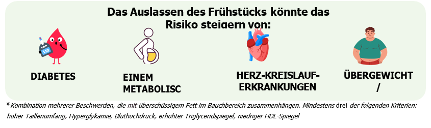Studien weisen darauf hin, dass das Auslassen oder späte Einnehmen des Frühstücks negative gesundheitliche Folgen haben kann , da es die Blutzucker- und Lipidregulation stört und das Risiko für niedriggradige Entzündungen erhöht. Diese Risiken könnten mit einem späten Abendessen (weniger als 2 Stunden vor dem Schlafengehen) in Verbindung gebracht werden.
