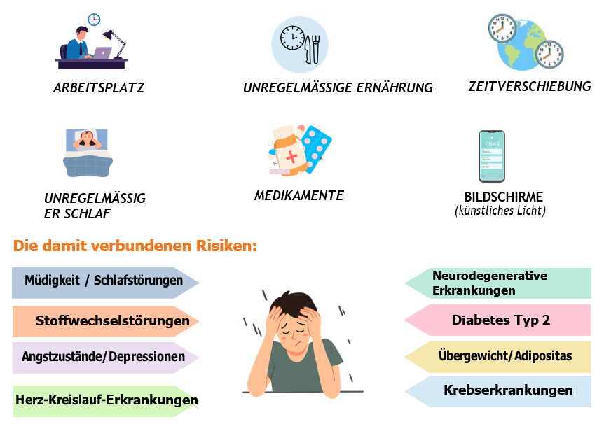 Die zirkadiane Desynchronisation kann durch verschiedene interne Faktoren (z. B. Pathologie, Stress) ausgelöst werden, aber auch durch externe Faktoren wie: