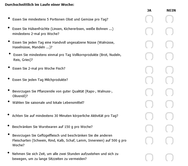 ⚠️ Dieser Fragebogen kann in keinem Fall die Empfehlung einer Gesundheitsfachkraft ersetzen. Er soll lediglich allgemeine Orientierungen zu Ihrer Ernährung geben, und seine Ergebnisse sind mit aller Vorsicht zu interpretieren. Er ist nicht bestimmt für Personen mit Krankheiten, die eine spezielle Diät oder eine individuelle Betreuung in Ernährungsfragen benötigen.