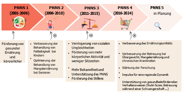 Im Laufe der Jahre wurde der Umfang des PNNS erweitert (PNNS 1 → PNNS 4), um seine Ziele an die wissenschaftlichen Fortschritte und neue gesellschaftliche Probleme anzupassen.