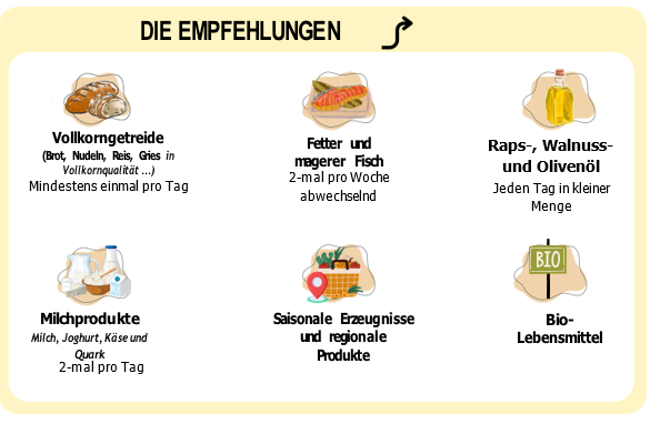 Die Empfehlungen des Nationalen Programms für gesunde Ernährung (PNNS) enthalten zuverlässige Leitlinien für eine ausgewogene Ernährung. Allerdings muss daran erinnert werden, dass die Ernährung sich nicht auf eine bloße Nährstoffzufuhr beschränkt: sie umfasst auch eine Dimension des Genusses und der Geselligkeit, die bewahrt werden muss. Diese Empfehlungen sollten deshalb als Orientierungshilfen für seine Entscheidungen und nicht als strenge und unveränderbare Vorgaben angesehen werden.