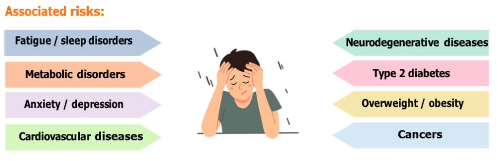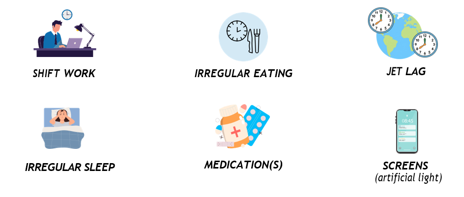 Circadian desynchronization can be triggered by various internal factors (e.g., pathology, stress) as well as external factors such as: