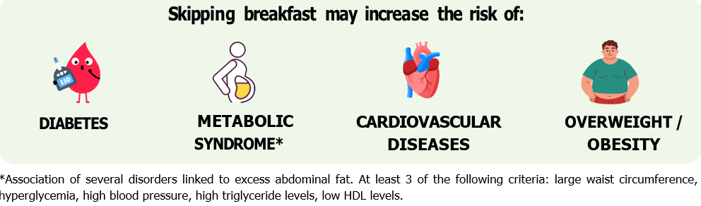 Studies highlight that skipping breakfast or eating it late may have negative health consequences by disrupting glycemic and lipid regulation and increasing the risk of low-grade inflammation. These risks may also be associated with a late dinner (less than 2 hours before bedtime).