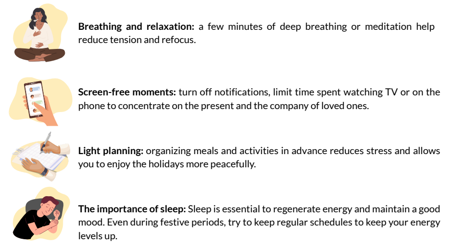 Holidays are synonymous with joy, but they can sometimes generate stress: meal preparation, organizing visits, shopping, and social obligations. Taking a few moments for yourself helps you enjoy this period better.