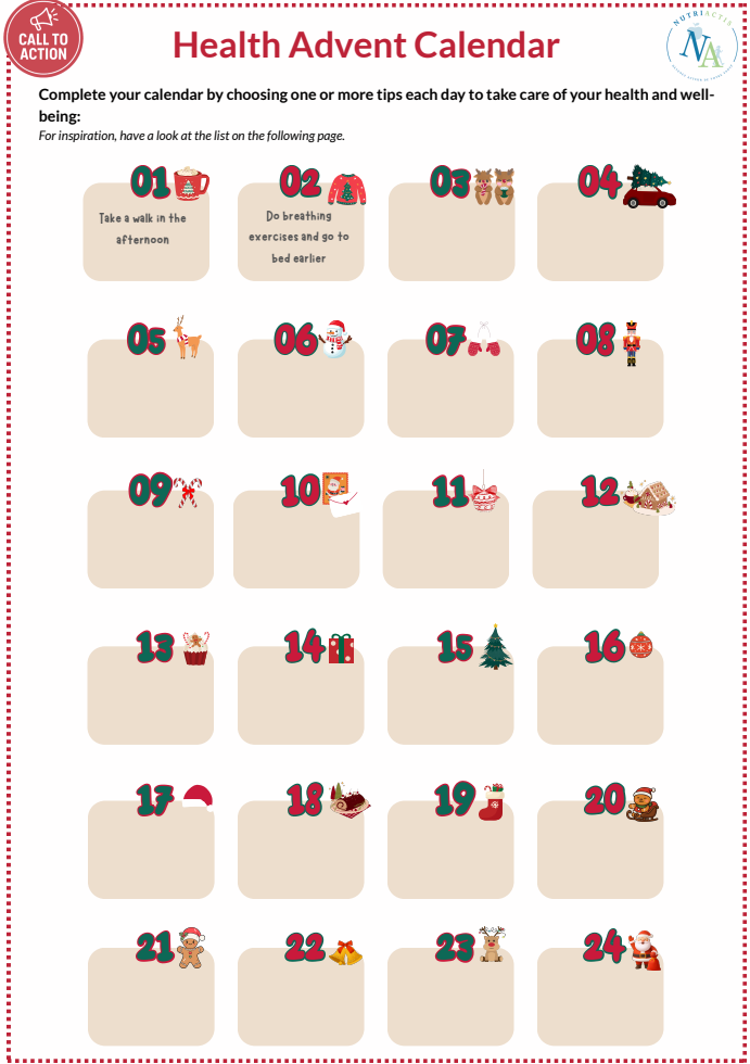 In this newsletter, we offer you tips to experience this period with serenity. By combining indulgence, balance, and well-being, everyone can fully enjoy the holidays. Discover on the last page our “call to action” to create your health Advent calendar!