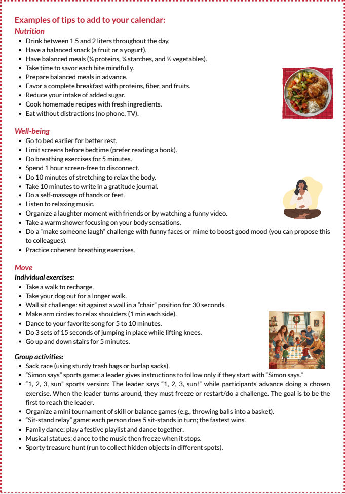 These fun moments strengthen social bonds while promoting movement. The idea is to integrate movement in an enjoyable and friendly way, to extend the pleasure of the holidays while taking care of your body.