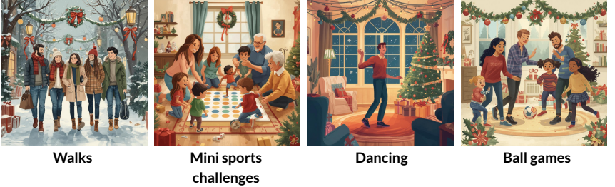Even during the holidays, it is possible and important to stay active. Gentle physical activity with family, friends, or alone helps maintain energy and contributes to overall well-being. Moreover, this type of activity encourages social interaction and creats a friendly atmosphere where everyone, regardless of age, can experience and share joyful moments together