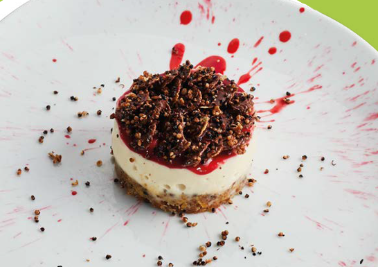 - Spread a spoonful of raspberry coulis on a plate. Place the cheesecake mould on top. Add another spoonful of raspberry coulis and top with corn flakes and crispy quinoa.