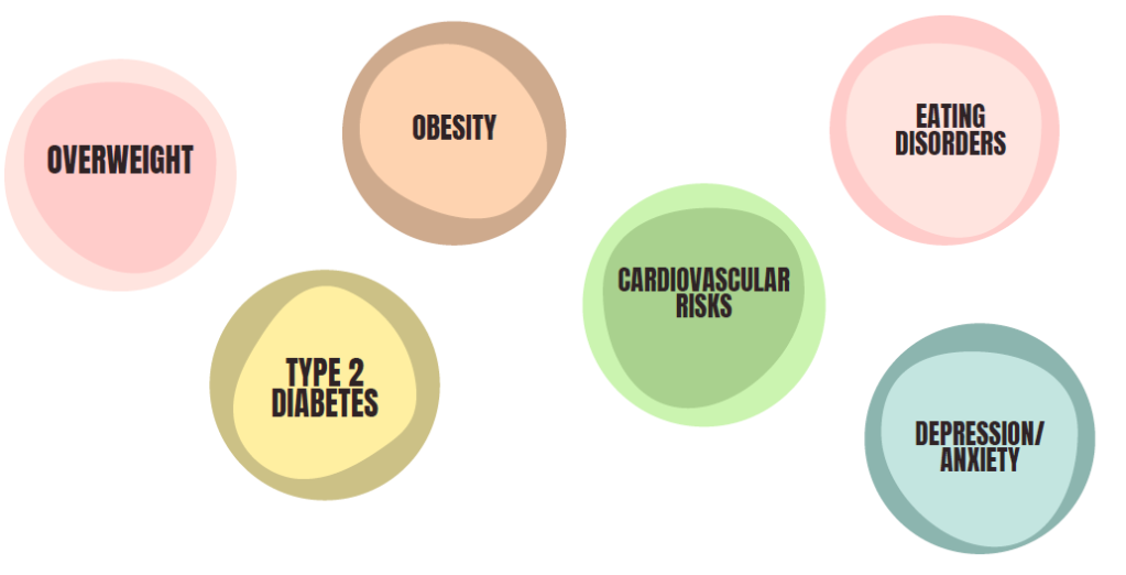 In the case of emotional eating, the foods consumed are generally fatty, sweet, salty, high in energy value and therefore often ultra-processed, which can have harmful consequences for health by increasing the risk of :
