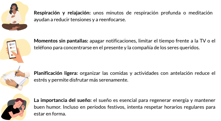 Combinando un sueño reparador y técnicas sencillas de manejo del estrés, las fiestas son más agradables y menos agotadoras, permitiéndote disfrutar plenamente cada instante con tus seres queridos.