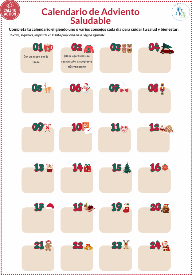 En este boletín, te ofrecemos consejos para vivir esta época con serenidad. Combinando placer, equilibrio y bienestar, cada uno podrá aprovechar al máximo las fiestas. ¡Descubre en la última página nuestro “call to action” para diseñar tu calendario de Adviento saludable!