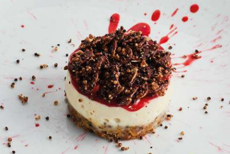 CHEESECAKEDE SOYA CONHOJUELAS DE MAIZCON CHOCOLATE,QUINUA Y COULISSEDE FRAMBUESA
