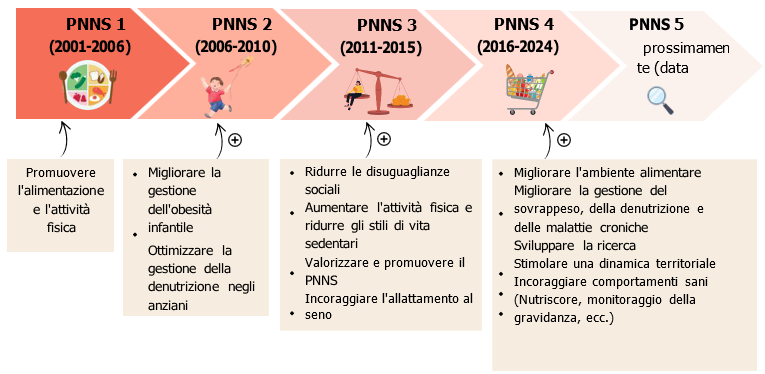 Il PNNS si è evoluto nel corso degli anni (PNNS 1 → PNNS 4) per adattare le sue sfide ai progressi scientifici e alle nuove problematiche della società.
