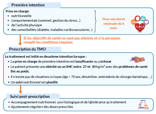 Les TMO font partie d’une prise en charge globale et adaptée à chaque personne. Ils ne sont pas proposés en première intention et ne sont envisagés que lorsque les mesures initiales n’ont pas permis d’atteindre les objectifs de santé fixés.