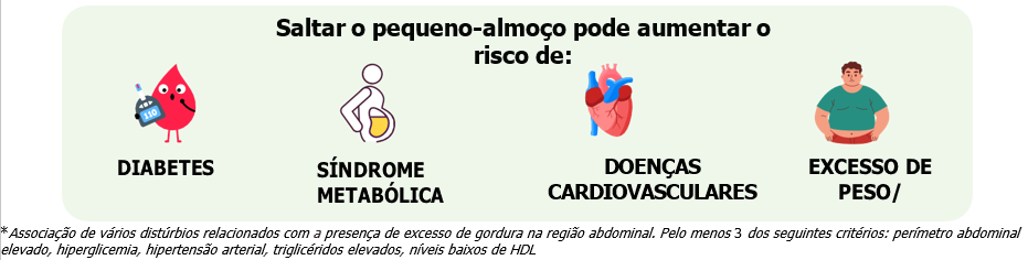 Estudos demonstram que saltar o pequeno-almoço ou tomá-lo tarde pode ter consequências negativas para a saúde, perturbando a regulação glicémica e lipídica e aumentando o risco de inflamação de baixo grau. Estes riscos podem estar associados a um jantar tardio (menos de 2 horas antes do deitar).