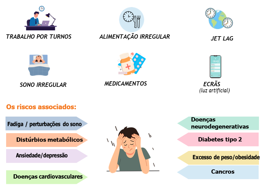 A dessincronização circadiana pode ser desencadeada por vários fatores internos (ex. patologia, stress), mas também por fatores externos, tais como: