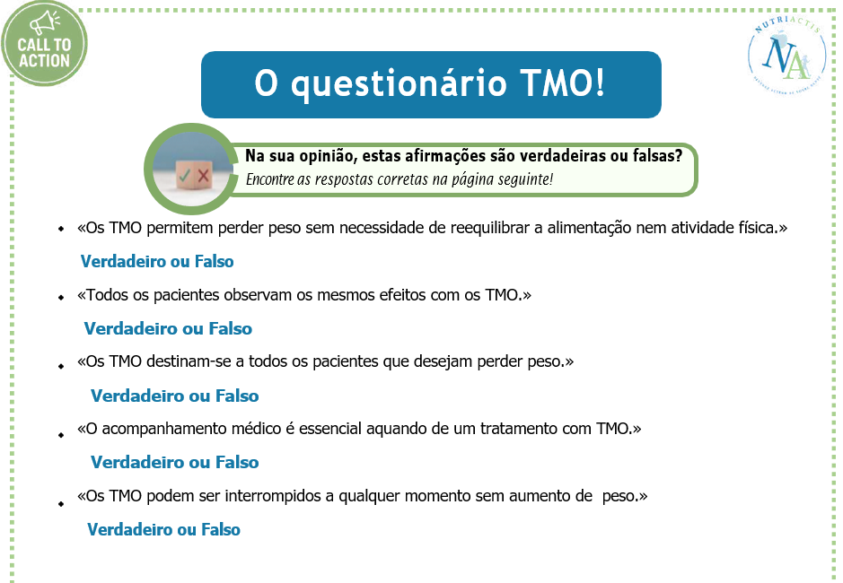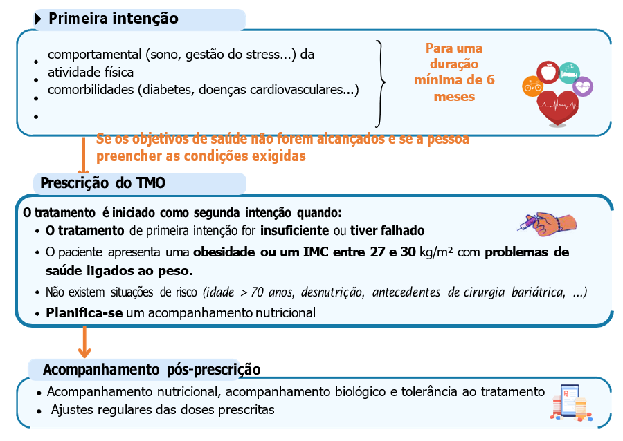 Os TMO são unicamente prescritos sob supervisão médica quando os tratamentos de primeira intenção não permitiram atingir os objetivos de saúde. Destinam-se a uma população que preenche critérios clínicos bem definidos, sendo essencial um acompanhamento regular com o médico para avaliação da perda de peso e a evolução das comorbilidades e sobretudo para controlo dos efeitos secundários, por vezes significativos, e dos riscos nutricionais.