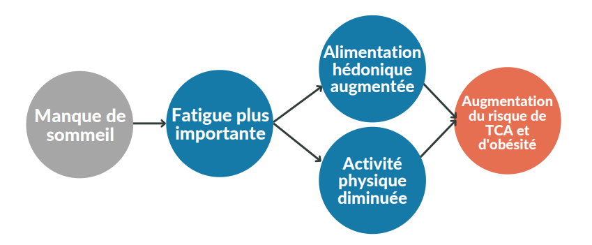 Il semblerait également que le moment d’endormissement influence aussi l’apparition d’une obésité et d’une hyperphagie en modifiant les habitudes alimentaires. En effet, plus la personne s’endort tard et plus elle est susceptible de grignoter après le dîner et de sauter le petit-déjeuner (cf. fiche Alimentation). De plus, un sommeil insuffisant entraîne inévitablement de la fatigue et par extension, une diminution de l’activité physique et une augmentation la sédentarité, favorisant l’obésité (cf. fiche Activité physique)